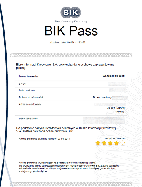 - Raport PLUS: Oprócz podstawowych informacji, zawiera dodatkowe dane dotyczące oceny punktowej BIK, która jest wskaźnikiem ryzyka kredytowego.